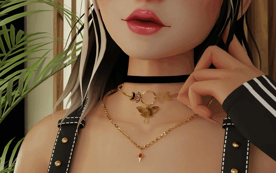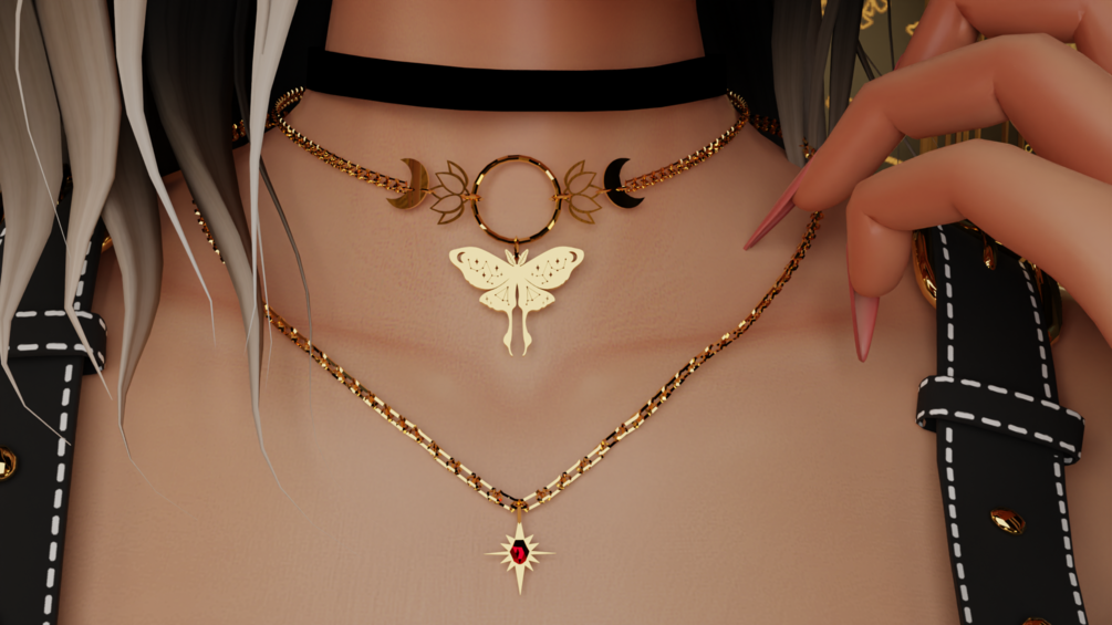 Jinxxy tags: moth, luna, lotus, moon, sun, gem, star, crystal, chain, choker, necklace, set, link, prety, cute, alternative, alt, gothic, edgy, boho, circle, ring