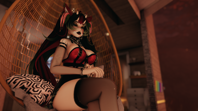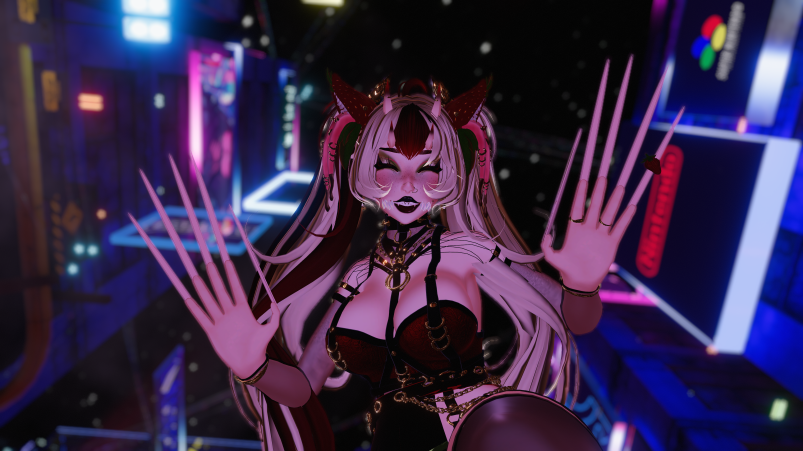 Head:Nessy (Edited Do Not Reuse)┊ Base:Zinpia (Heavily Edited Do Not Reuse) ┊Hair (Kitbash):Nessy [1/2/3/4]┊Face Texture:MaMachi┊Leg Harness/Collar/Heels (Retired)/Mesh Top/Corset Top/Hair Cuffs:TheThiccWitch┊Ears & Tail [Kitbash]:Eliza [Monster Heads] // TheThiccWitch [Tail Base & Spikes] // Eggly [Tongues]┊Long Nails:Skulli┊Mini Shorts/Stockings & Skirt:Vinuzhka┊Whipped Cream:MaMachi┊Utensil Jewelry:Koragira [Fork] // YamuVR [Knife]┊Face Teeth:FallenCupid┊MaMachi Logo Charm:Sriツ┊AV3 Toggles:Rafa┊Smooth Gestures:Combo Gestures┊All Retextures by foxmatcha & TheThiccWitch